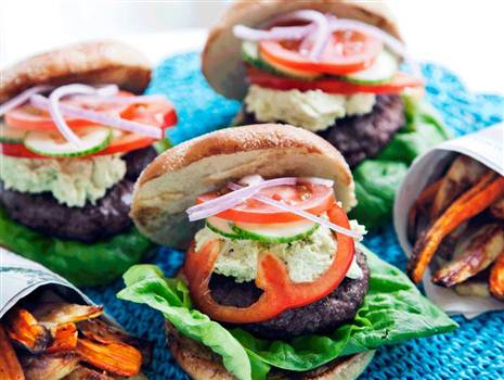 Härliga hamburgare med fetaoströra och rotfruktsfries