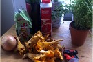 I med grädde, fond,vin & tomatpure Smaka av med salt, peppar & lite färska timjan
