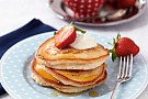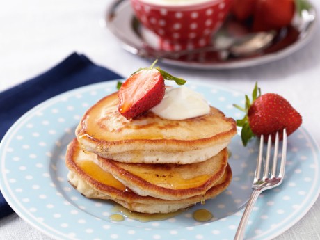 5. Vispa crème fraichen med elvisp tills den blir fluffig. Servera pannkakorna med vispad crème fraiche, jordgubbar och lönnsirap.