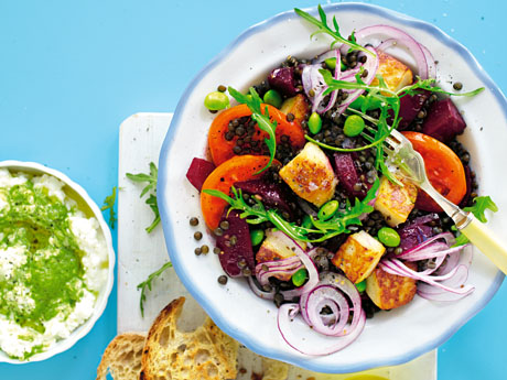 1. Koka rödbetorna mjuka i saltat vatten ca 25 min. 2. Koka linserna i rikligt med saltat vatten ca 25 min. Tillsätt edamamebönorna när det återstår 1 minut av koktiden. Häll av i sil och skölj linser och bönor i kallt vatten.3. Skölj och skiva tomaterna. Skala och skiva rödlöken tunt. 4. Kesoröra: Mixa 1 näve rucola (spara resten till servering), honung, vitlök, 2 msk olja och 1 msk vatten. Tillsätt keson. Krydda med 2 krm salt och 1 krm peppar. 5. Blanda linser och bönor med 1 msk olja, 2 msk vinäger och 1 krm salt. Skala och klyfta de kokta rödbetorna.6. Tärna halloumin. Stek den frasig på hög värme i 1 msk olja. 7. Varva linser, bönor, rödbetor, tomat, lök, halloumi och den sparade rucolan. Servera med kesoröran.