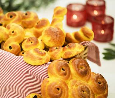 3.Ta upp degen på mjölad arbetsbänk. Knåda ev. i resten av mjölet. Baka ut degen till lussekatter. Lägg dem på plåtar med bakplåtspapper. Låt jäsa under bakduk 30-45 minuter. Sätt ugnen på 225˚C.