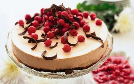Låt tårtan stå framme ca 30 min före servering. Garnera tårtan med hallon och choklad. Värm hallonen till såsen, blanda i florsocker och servera såsen till tårtan. Värm hallonen och blanda i florsocker.