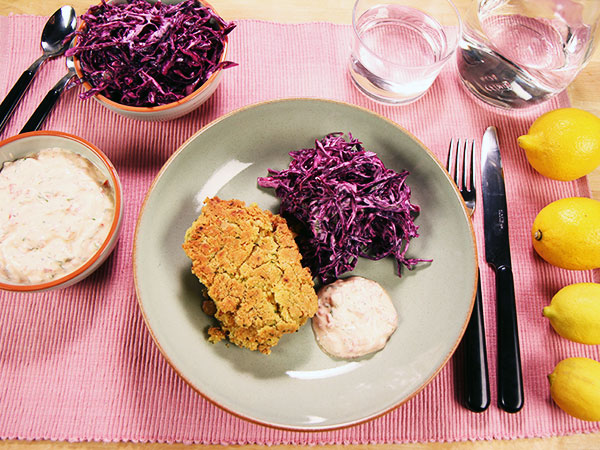 Mixa samman alla ingredienser till bönbiffarna, smaka av med salt och peppar och låt stå i ca 10 minuter. Hacka paprika och persilja till såsen mycket fint. Blanda med yoghurt och smaka av med salt och peppar. Strimla kålen och hacka persiljan. Rör samman yoghurt, citron och senap till en dressing och sväng runt salladen med denna. Smaka av med flingsalt. Forma och stek biffarna i rikligt med olja på varje sida. Servera med sås och sallad.