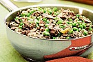 Skala och hacka löken. Tillsätt den och låt den fräsa tillsammans med köttet några min.