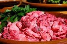Blanda samman majonnäsen med lätt crème fraiche och senap. Blanda i rödbetorna, äpple och löken. Smaka av med salt och peppar.