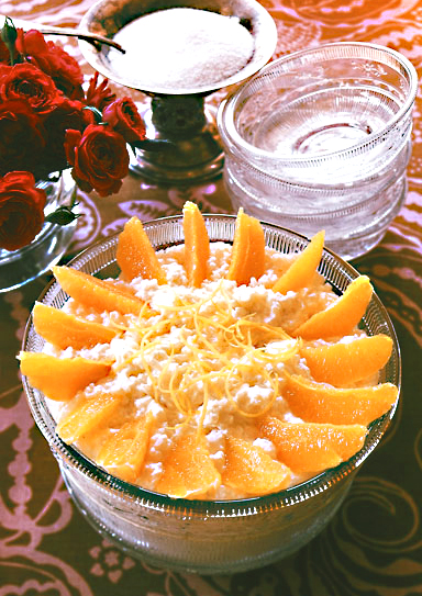Koka riset klart, ca 20 minuter, i lättsaltat vatten och låt det sedan rinna av och kallna. Vispa grädden med socker och vanilj. Vänd ned riset i grädden. Skär apelsinerna i skinnfria klyftor, vänd ned hälften i riset och använd resten till garnering. Finstrimlat apelsinskal som förvällts hastigt kan också användas till garnering.