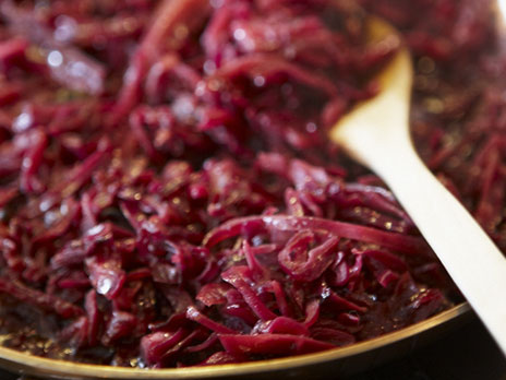 Strimla rödkål. Skala och skiva löken plus äpplen. Bryn rödkål, lök och äpplen med gelén och sirapen (honungen). Ha i vinägern, vatten och kryddnejlikor.