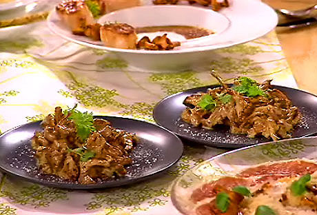 Reducera grädden tills den blivit behagligt tjock. Tillsätt kantarellerna och smaka av med salt och peppar.