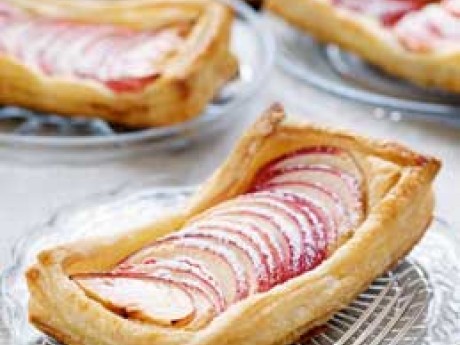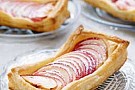 1. Sätt ugnen på 200°. 2. Tina smördegsplattorna i rumstemperatur ca 20 min. Nagga dem mitt på 4–5 gånger. 3. Halvera, kärna ur och skär äpplena i tunna skivor. Lägg skivorna tätt omlott i en rad på varje botten. Pensla med smör och sikta över ca hälften av florsockret. Skär en skåra i degen runt äppelraderna, men inte rakt igenom (det är för att degen runt om ska resa sig upp under gräddningen). 4. Grädda mitt i ugnen tills florsockret har smält, 6–8 min. Ta ut plåten och sikta över resten av florsockret. Grädda ytterligare 8–10 min. Serveras nygräddade.