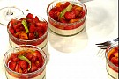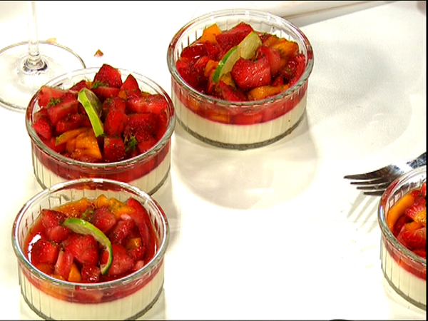 Snitta vaniljstången på längden och skrapa ur fröna. Koka upp grädde, mjölk, socker, vaniljstång och frön. Ställ kastrullen åt sidan och låt blandningen stå och dra i ca 30 minuter. Blötlägg under tiden gelatinbladen i kallt vatten i ca 5 minuter. Ta upp och krama ur dem en aning och låt dem rinna av på hushållspapper. Sila bort vaniljstången och koka upp grädden på nytt. Flytta kastrullen från värmen, lägg i gelatinbladen och rör om tills de lösts upp. Häll blandningen i 4 portionsformar, ca 8 cm i diameter. Låt svalna och ställ att stelna i kylskåp i ca 3 timmar. Skölj, snoppa, och skär jordgubbarna i bitar. Skala kiwin och mangon och skär dem i små bitar. Rör samman limeskal och socker i en skål och blanda i frukterna. Låt stå i 15-30 minuter. Stjälp upp pannacottan på ett dessertfat (peta lite försiktigt, runt om i formarna, med en vass kniv för att få dem att lossna). Lägg en rejäl sked frukt och bär vid sidan om.
