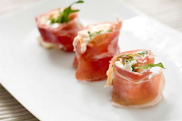 Finhacka fetaosten och blanda väl med cremè fraichè. Lägg ut skinkan på en skärbräda så att långsidorna överlappar varandra. Bred på ostkrämen. Klicka ut mangochutney och lägg på ruccolan. Rulla ihop och ställ i kylen minst 1 timme. Skär i bitar.