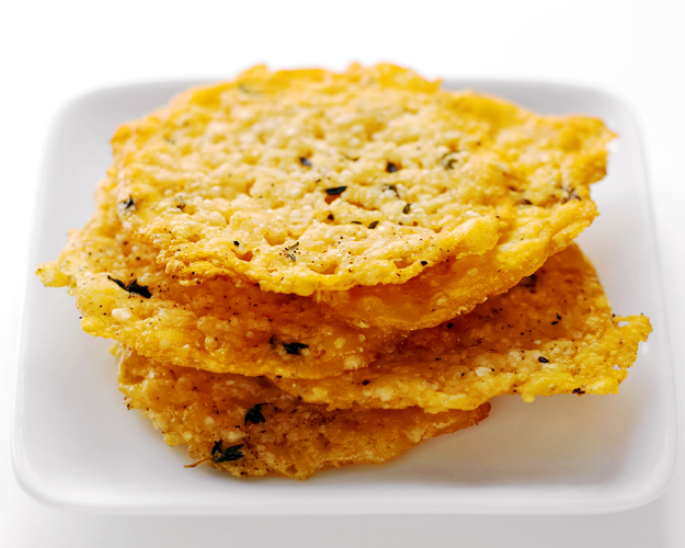 Strö timjan och mal lite svartpeppar över osten. Grädda i ca 5 minuter tills osten får gyllenbrun färg. Ta ut och låt svalna. Förvara chipsen mellan smörpapper i en lufttät burk.