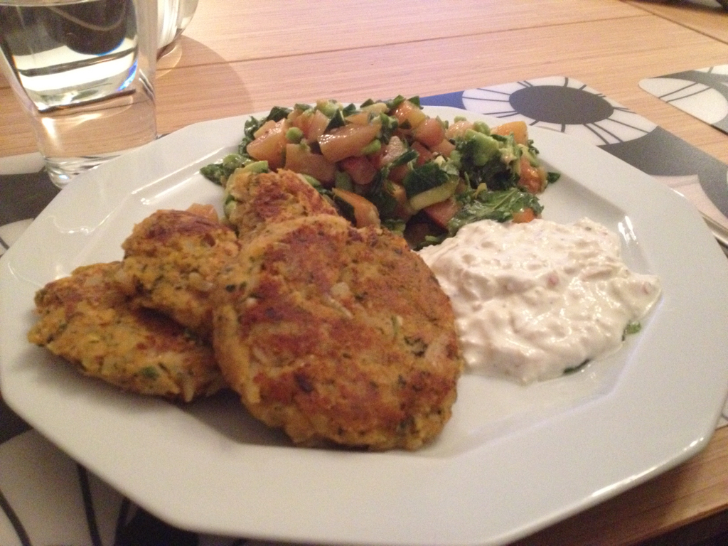 Garbanzobiffar med äppeltzatziki och avokado- och myntasallad