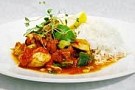 4. Strax före serveringen hälls citronsaften över och baconbitarna läggs på. Servera med kokt ris och grönsallad till. Dekorera gärna med en timjankvist och en citronklyfta.