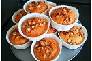 bakpulver och salt. Rör därefter ner äppeljuice, olja, ägg och äggvita. Vänd ner äppelbitarna (och valnötterna) samt 2 dl av smuldegen. Häll smeten i formarna, ca 3/4 och strö över den resterande skulderna på toppen.Grädda