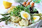 1. Sås: Skölj bönorna och låt dem rinna av. Mixa bönor, 3 msk kapris och citronsaft. Tillsätt äggulorna och blanda om. Mixa i oljan droppvis. Salta och peppra. Häll såsen i en skål. Strö över 2 msk kapris. 2. Primörer: Sätt ugnen på 250 grader. Bryt blomkålen i buketter. Skrapa morötter, rödbetor och potatis och skär i bitar. Bryt av den nedre delen på sparrisen och skär dem i bitar. Ansa och skär salladslöken i bitar. Blanda blomkål, morötter, rödbetor och potatis med olja och salt på en plåt med bakplåtspapper. 3. Rosta mitt i ugnen ca 15 min. Rör om någon gång under tiden. Tillsätt sparris och salladslök. Tillaga ytterligare 15 min. 4. Rosta pinjenötterna i torr stekpanna. Skala och halvera äggen. Lägg primörer och rucola på ett stort fat. Strö över nötter och toppa med ägghalvor. Servera med sås och citronklyftor.