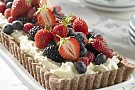 3. Blanda choklad och grädde, vispa tjockt. Häll i pajskalet och garnera med bär.