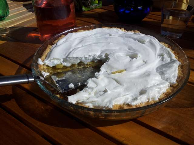 Bred marängen på pajen och grädda i mitten av ugnen tills marängen börjar få litet färg och känns torr på ytan, cirka 30 minuter.