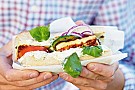 Börja med tsatsikin. Riv gurkan grovt och låt den rinna av i en sil, pressa ut vätskan. Blanda gurka med pressad vitlök, yoghurt, olja, salt och peppar i en bunke. Skär halloumin i cm-tjocka skivor. Skala löken och skär lök och tomat i skivor. Skär zucchinin i skivor, gärna på längden då blir de lättare att grilla. Skär baguetten i 4 bitar (för 4 port). Pensla zucchiniskivorna med olja och grilla dem och halloumin några minuter på varje sida. Dela bröden och bred på tsatsikin. Lägg i basilikablad, tomat, zucchini, lök och halloumi. För alla Fri från ägg. Kontrollera brödet för laktos, mjölkprotein och ägg. Gör glutenfri: välj glutenfritt specialbröd. Gör laktosfri: använd låglaktoshalloumi eller laktosfri salladsost. Använd laktosfri matyoghurt. Gör mjölkproteinfri: ersätt halloumiost med tofu eller annat mjölkfritt ostalternativ. Ersätt matyoghurt med mjölkfritt alternativ, t ex Sour Supreme (innehåller soja).