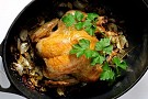 En kyckling tillsammans med mängder av vitlöksklyftor. Har man inte ätit den här rätten kan det nog vara svårt att föreställa sig vad det ska smaka. Men det smakar inte vitlök på det där starka sättet. I Provence kallas vitlök för fattigmanstryffel och det förstår man här. Vitlöken blir oerhört mild och mjuk. Kläm det goda moset ur skalet och bred på en skiva bröd.