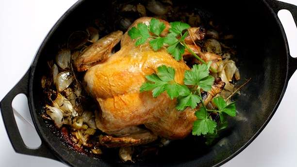 Värm ugnen till 220˚. Salta och peppra kycklingen på in- och utsida. Fyll kycklingen med hälften av örterna och hälften av sellerin, all persilja och 4-5 vitlöksklyftor. Klappa in olivolja på utsidan av kycklingen. Lägg den i en ugnssäker gryta. Lägg resten av örterna, sellerin och vitlöksklyftorna runt. Salta och peppra och ringla över lite olivolja. Lägg locket på grytan och sätt in i ugnen tills kycklingen är färdig, ca 1 timme och 45 minuter. Lägg upp på ett serveringsfat tillsammans med vitlöksklyftorna. Sila grönsakerna och servera skyn till. Rosta ett gott lantbröd att breda vitlöksmoset på.