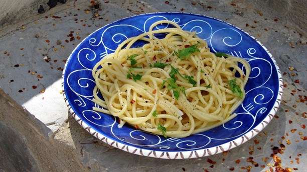En perfekt rätt när man är hungrig men inte orkar laga mat, eller när man kommer hem sent på kvällen och bara är sugen. Kan alltid beställas på italiensk restaurang även om den sällan står på menyn. Det är svårt att säga hur mycket chili man ska ha, styrkan på frukterna varierar så mycket. Men det ska vara en het rätt. Och det ska inte sparas på olivoljan heller. Sådana här enkla rätter gör att man verkligen känner skillnad på pasta. En dyrare spaghetti som gjorts på bästa durumvete, valsats genom mässingsmunstycken och torkats långsamt är lite sträv på ytan. Den välsmakande oljan fastnar i det sträva.