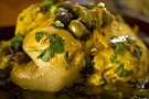 Tillsätt oliverna, citronen, grovhackad persilja och koriander. Rör om och låt koka ytterligare femton minuter. Smaka av såsen. Om den är för vattnig – ta upp kycklingen, svep in den i folie och låt såsen koka ihop på stark värme i fem minuter. Om du vill kan du dela kycklingen i bitar och lägga ner i såsen.
