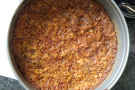 Vispa ägg och socker pösigt. Blanda ner övriga ingredienser till chokladsmeten. Häll smeten i formen.