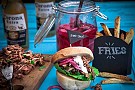 Äntligen dags att äta! Halvera frallorna och lägg på det gafflade köttet. Lägg på sallad, ketchup, majonnäs och generöst med syltat rödlök. Servera med rykande heta pommes frites.