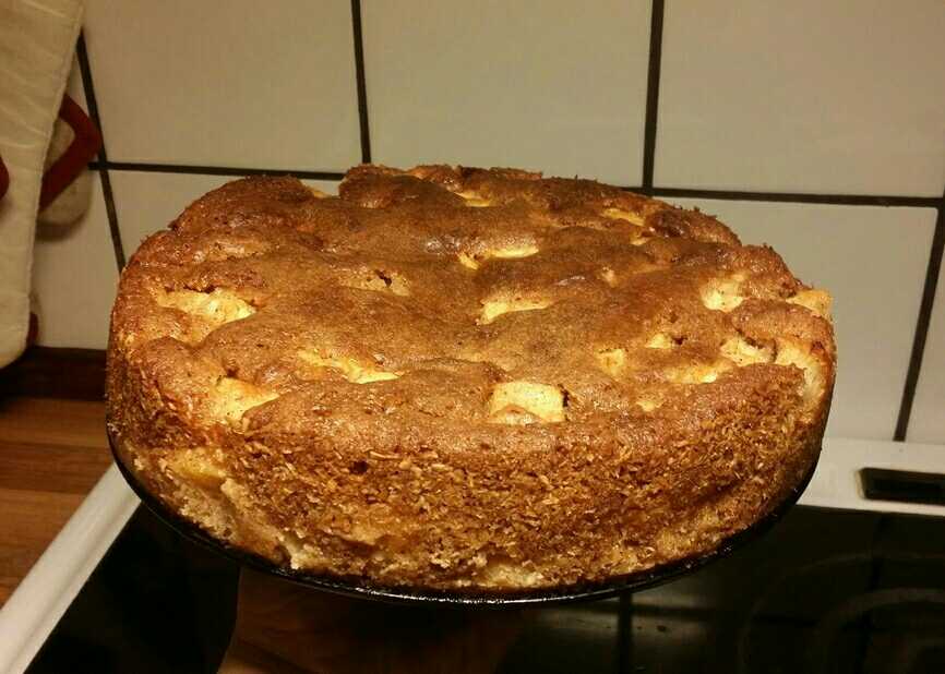 Rör ner äpple och häll smeten i kakformen. Smeten blir tjock, sÃ¥ använd en slickepott för att sprida ut den.Â