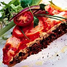 3. Lägg köttfärsfyllningen i pajskalet och bred över crème fraîche. Riv osten och skiva tomaterna. Fördela tomatskivorna ovanpå och strö till sist över osten.