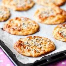Sätt ugnen på 200 grader. Blanda allt i en bunke. Låt svälla ca 20 minuter. Forma 8 runda bröd på ett bakplåtspapper. Strö över sesamfrön. Grädda ca 20 minuter.