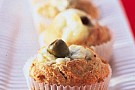 3. Ställ stora muffinsformar av papper i en muffinsplåt med 12 hål. Fördela smeten i formarna. Gör en grop i smeten och fyll med ost och oliver. Grädda mitt i ugnen ca 20 min.