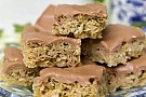 3. Grädda kakan mitt i ugnen i 15–20 min. Ta ut kakan och hyvla nougaten i tunna skivor över när den fortfarande är varm. Skär kakan i rutor.