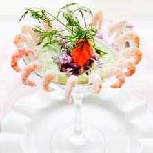 2. Mixa avokado med crème fraiche, citronsaft och lite salt. Skeda upp i cocktailglas. Strö över rödlöken och rada räkor runt kanten. Klicka i lite stenbitsrom och dekorera med dill.