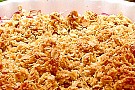2. Nyp ihop smör eller margarin, socker, havregryn och vetemjöl. Fördela smulet över rabarbern. Grädda i 20-25 minuter. Tips: Smulet blir gott över nästan vilken frukt eller vilka bär som helst. Äpplen är alltid en höjdare, liksom blåbär.