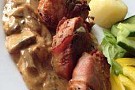 7. Lägg köttet i ungssäker form. Låt stå i ugn 220 grader ca 15 minuter eller tills baconen är klara.
