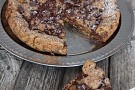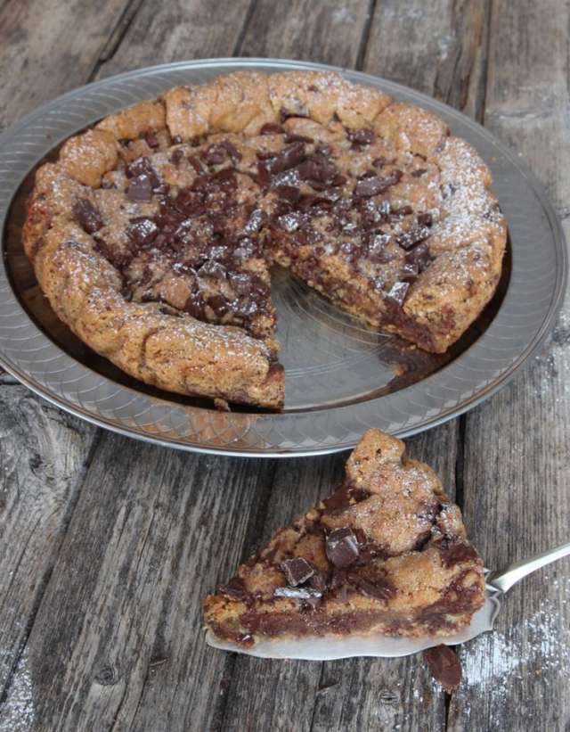 Tryck ut smeten i en smord och bröad springform, 22–23 cm i diameter. Strö över lite grovhackad choklad.