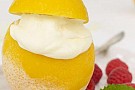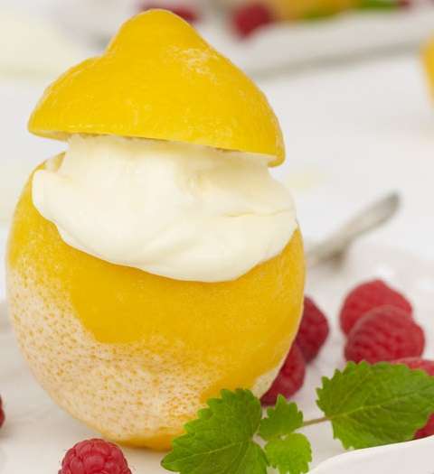 Skeda över lite av den överblivna glassen på toppen av varje citron och garnera med hallon och citronmeliss.