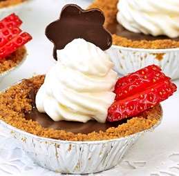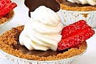 Spritsa en klick grädde på bakelserna vid servering och garnera med jordgubbar och chokladdekorationer.