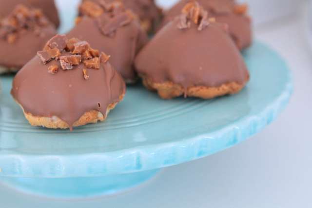 Doppa biskvierna i chokladen, vrid dom lite så att överflödig choklad rinner av.