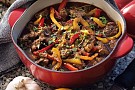 4. Strimla röd och gul paprika som får sjuda med ca 2 min före servering. Servera med bröd och yoghurt.