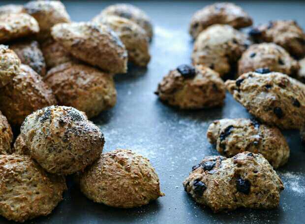 In the morning:Â Remove the dough from the fridge. Preheat oven to 250 C/ 500 F. Line two baking sheets, grab a spoon and use it to scoop up the dough and place 7-8 buns on each sheet. Brush the buns with water or milk and sprinkle a little seeds on if you prefer. Bake the buns in the oven for 12-15 min until golden and crisp.