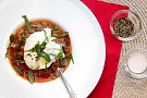 Middelhavssuppe med tomat, prosciutto di parma og posjert egg