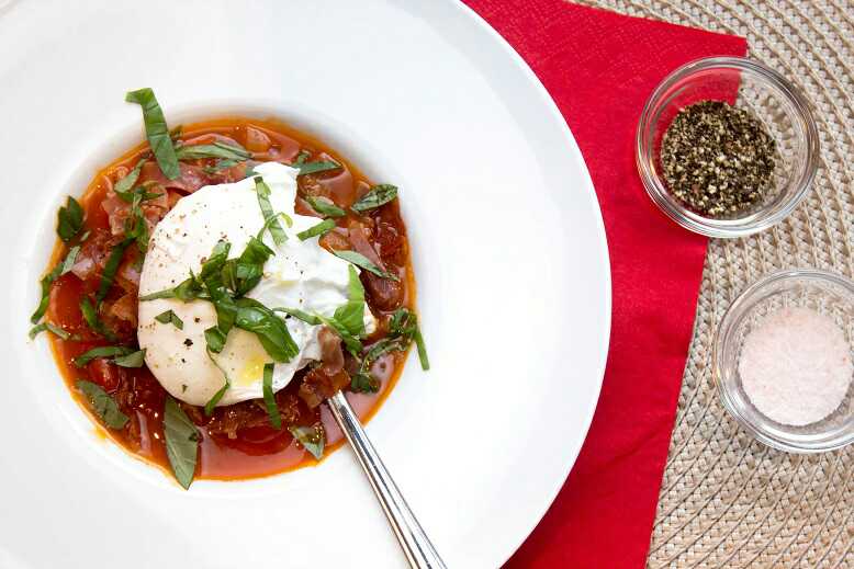 Servér suppen med prosciuotto, posjert egg og grovhakket basilikum.