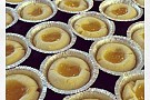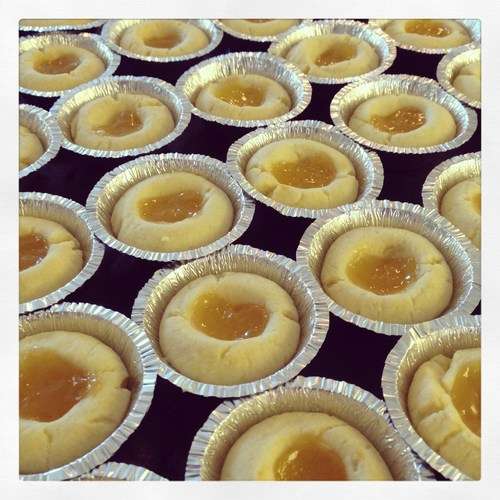 Pudra delarna med ett hål i med florsocker. Spritsa, eller klicka ut ca en tsk lemoncurd på varje botten utan hål på den sida som varit nedåt på plåten.