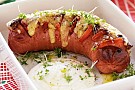 1. Sätt ugnen på 225°. Gör ca 10 djupa snitt i korven och lägg den i en ugnssäker form. Skiva tomaten. Tryck ner skivorna i korven. Bred på senap och strö över ost. Gratinera mitt i ugnen ca 30 min.
