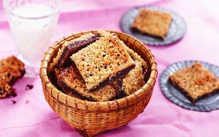 Lägg bakplåtspapper i en långpanna ca 30x45 cm och häll i smeten. Grädda i mitten av ugnen 10-12 min.