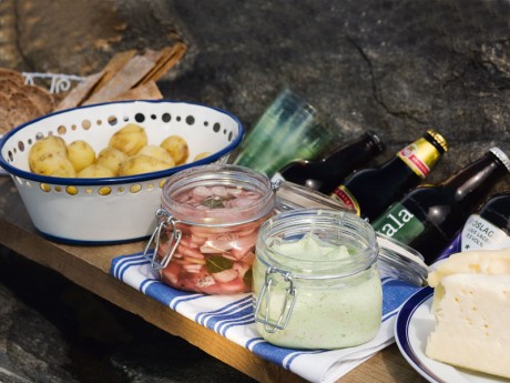 4. Rör samman såsen med resten av yoghurten. Smaka av med salt och senap. Lägg i strömmingarna. Låt stå kallt ca 1 dygn före servering.