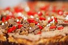 5. Dajmgrädde: Vispa grädden tills den får mjuka tippar. Sikta ner kakao och florsocker och rör om. Hacka dajmen grovt och rör ner. Bred ut toppingen på den avsvalnade tårtan och dekorera med strössel.